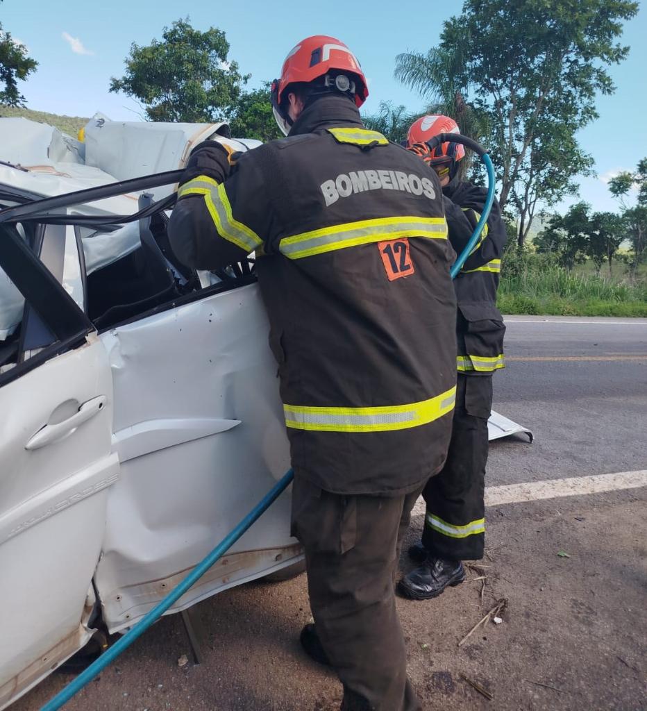 Corpo de Bombeiros realiza desencarceramento do corpo de duas vítimas que ficaram presas em ferragens após acidente na BR-070