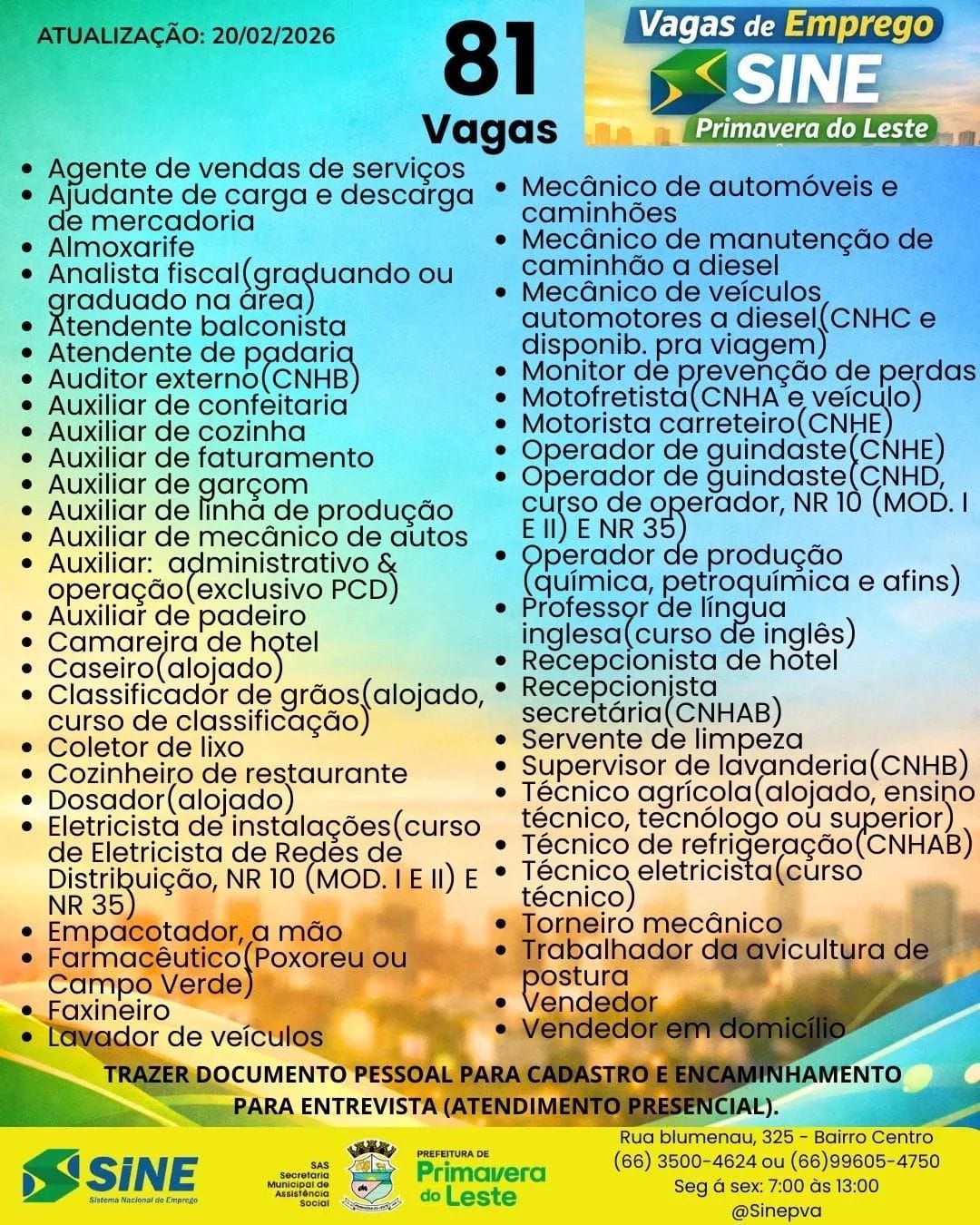 O Sistema Nacional de Emprego (SINE) de Primavera do Leste segue consolidando seu papel estratégico na geração de emprego e renda no município. A unidade, coordenada por Bruno Aquino, funciona nas dependências das sedes conjuntas das Secretarias Municipal de Assistência Social e também de Desenvolvimento Econômico, integrando atendimentos com o Procon Municipal de Primavera do Leste e outros órgãos públicos, garantindo mais eficiência e comodidade à população. Neste quinta-feira, 19, o SINE contabiliza 85 vagas de emprego em aberto, contemplando diversas áreas e níveis de experiência. O atendimento é totalmente gratuito e inclui cadastro, atualização de dados, encaminhamento para entrevistas e orientação profissional. Além do atendimento aos trabalhadores, a coordenação destaca a importância da participação ativa das empresas no fortalecimento do mercado formal de trabalho no município. Segundo o coordenador do SINE, Bruno Aquino, o envolvimento do setor empresarial é fundamental para ampliar os resultados positivos na geração de empregos. “É muito importante que as empresas procurem o SINE e cadastrem suas vagas conosco. Quando a contratação acontece por meio do nosso sistema, isso contribui diretamente para os dados oficiais do emprego formal, fortalecendo os números do município junto ao Cadastro Geral de Empregados e Desempregados e ao Ministério do Trabalho e Emprego. Isso garante mais transparência, organização e resultados concretos para Primavera do Leste”, destacou. O registro das admissões impacta diretamente os indicadores do Cadastro Geral de Empregados e Desempregados (CAGED) e do Ministério do Trabalho e Emprego, reforçando as estatísticas de geração de empregos formais e contribuindo para o desenvolvimento econômico local. Para quem pretende concorrer a uma vaga de emprego, deve comparecer ao local munido de documentos pessoais. O atendimento é realizado de segunda a sexta-feira, das 7h às 13h e o órgão está localizado na rua Blumenau, 329, no centro de Primavera do Leste.Coordenadoria de Comunicação