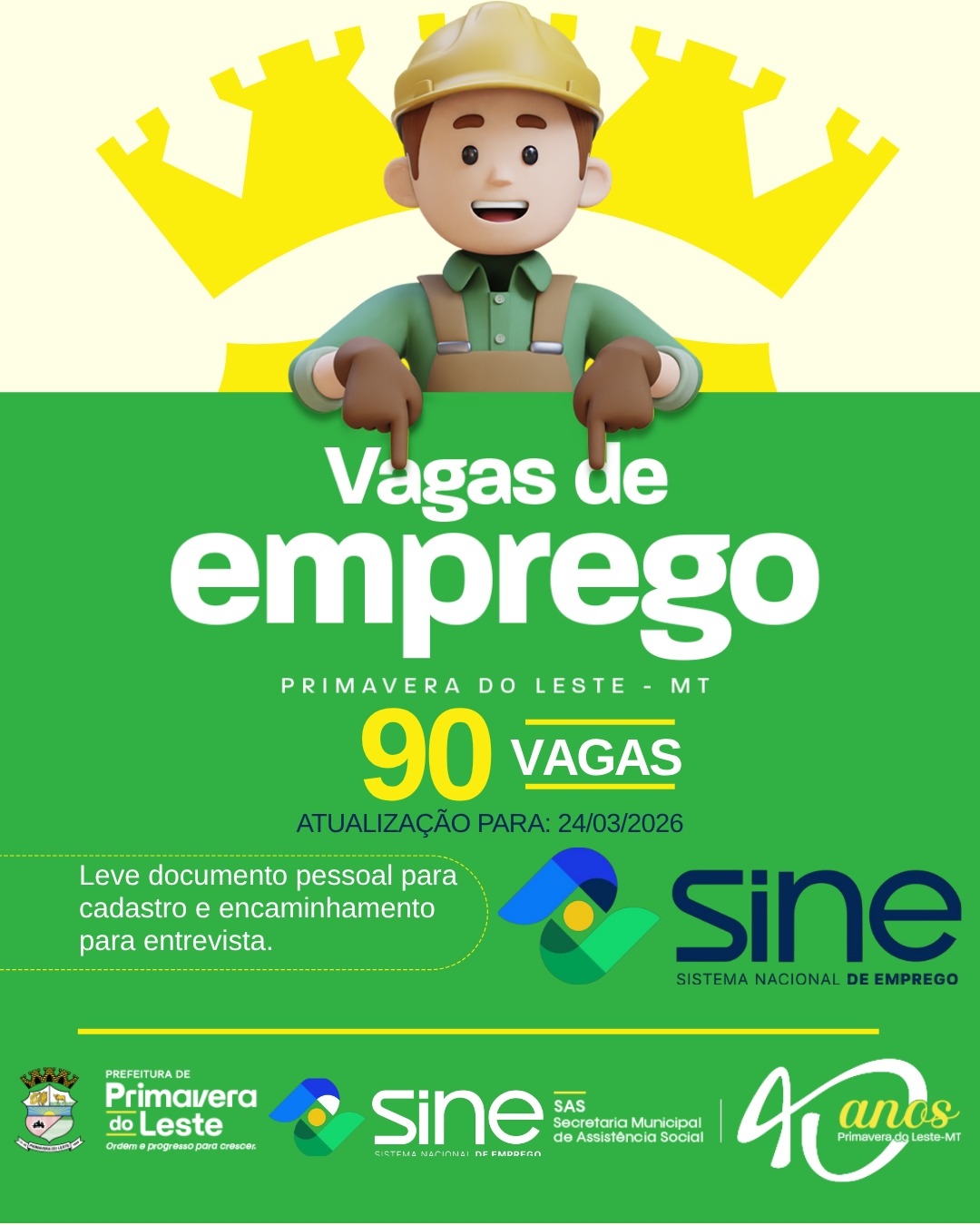 O Sistema Nacional de Empregos (SINE), por meio da unidade municipal vinculada à prefeitura de Primavera do Leste, inicia a semana com a oferta de 90 vagas de emprego em diversas áreas de atuação. As oportunidades contemplam diferentes níveis de qualificação e incluem funções como açougueiro, vendedor, farmacêutico, ajudante de obras, balconista, entre outras. As vagas são disponibilizadas por meio de cadastro direto no sistema, facilitando o acesso dos trabalhadores às oportunidades. Além de intermediar a mão de obra, o SINE também convida empresários do município a cadastrarem suas vagas, contribuindo para o fortalecimento dos dados oficiais do Cadastro Geral de Empregados e Desempregados (CAGED), vinculado ao Ministério do Trabalho e Emprego. A ampliação desses registros garante maior consistência e precisão nas informações relacionadas ao mercado de trabalho local. O coordenador Bruno Aquino reforça a importância de os candidatos comparecerem munidos de documentos pessoais e, nos casos de entrevistas agendadas, levarem também seus currículos atualizados. O órgão funciona de segunda a sexta-feira, das 7h às 13h, oferecendo suporte tanto para trabalhadores quanto para empresas. As vagas podem contemplar não apenas moradores de Primavera do Leste, mas também candidatos de municípios da região, como Poxoréu e Campo Verde. Outro destaque é a estrutura disponibilizada pelo SINE, que conta com três salas destinadas à realização de entrevistas. Empresas interessadas, inclusive aquelas localizadas fora do município, podem agendar o uso do espaço para conduzir processos seletivos, ampliando as possibilidades de contratação. Para quem deseja obter mais informações ou se candidatar a uma das vagas, o atendimento é realizado na Rua Blumenau, nº 325, na região central de Primavera do Leste, no antigo Primacredi.Coordenadoria de Comunicação