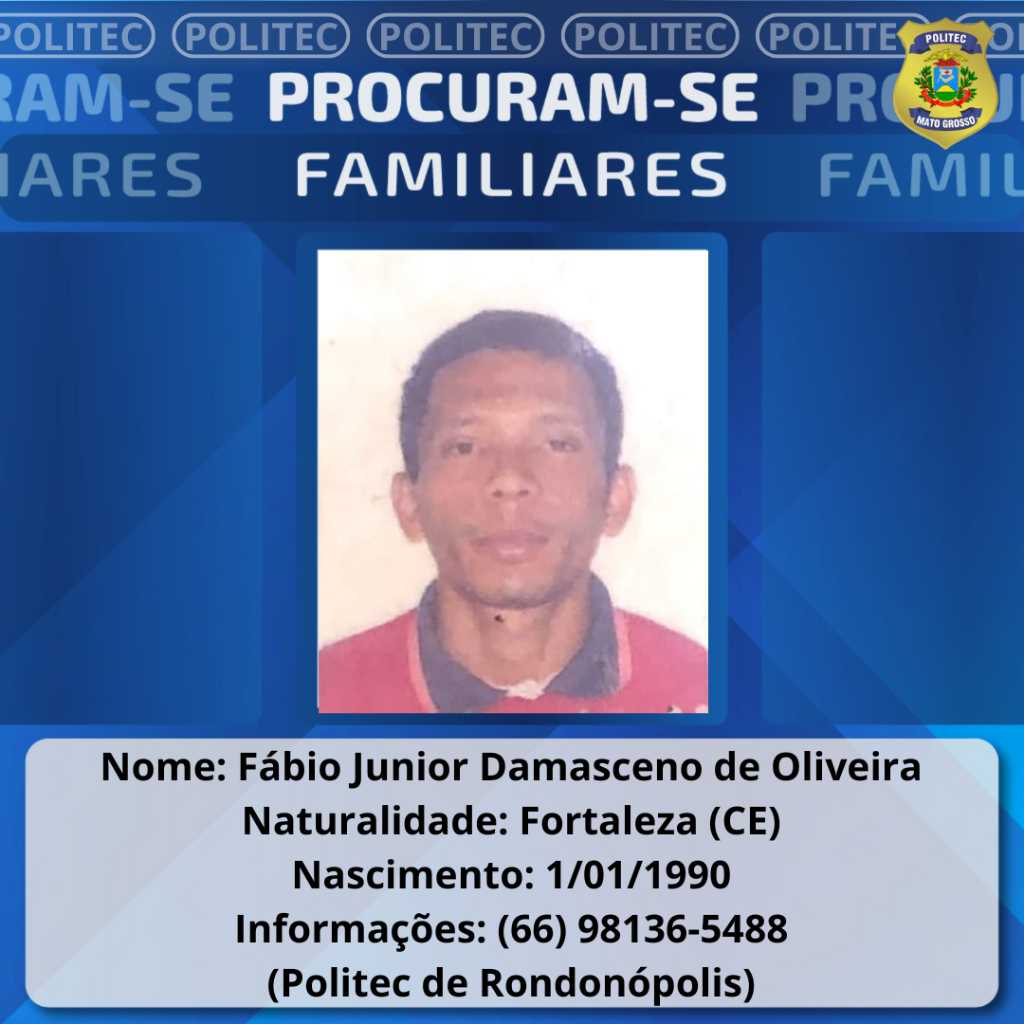 A Perícia Oficial e Identificação Técnica (Politec) busca familiares de duas pessoas que foram identificadas pela Gerência Regional de Identificação de Rondonópolis, mas que, até o momento, não tiveram parentes localizados, o que impede a retirada dos corpos e o sepultamento. No município, a Politec procura familiares de Fábio Júnior Damasceno de Oliveira, natural de Fortaleza (CE), nascido em 1º de janeiro de 1990, filho de Manuel Cosmo de Oliveira e Maria Sobrinha Damasceno Moreno. Ele foi encontrado sem vida em sua residência no dia 2 de janeiro de 2026.