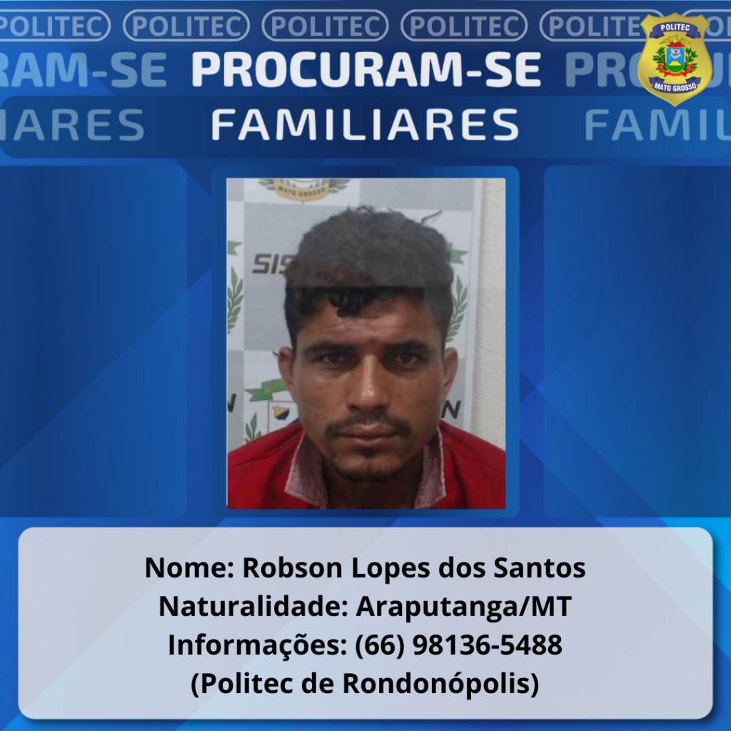 Também em Rondonópolis, busca-se contato com parentes de Robson Lopes dos Santos, natural de Araputanga (MT), nascido em 5 de agosto de 1989, filho de Cida Aparecida de Souza e João Lopes dos Santos. Ele foi vítima de homicídio no dia 2 de janeiro de 2026, no bairro Pedra 90. Segundo informações da Politec, ele possui familiares na região Norte do estado.